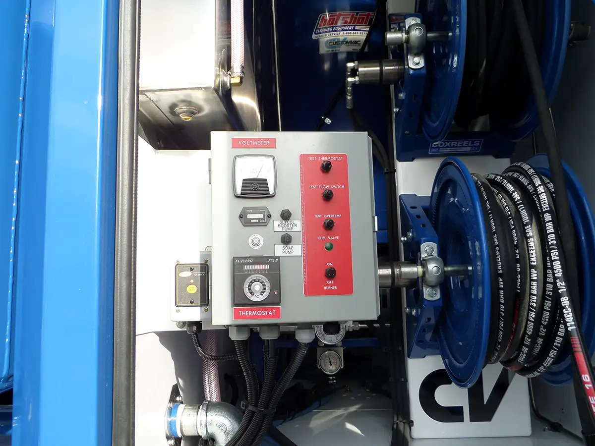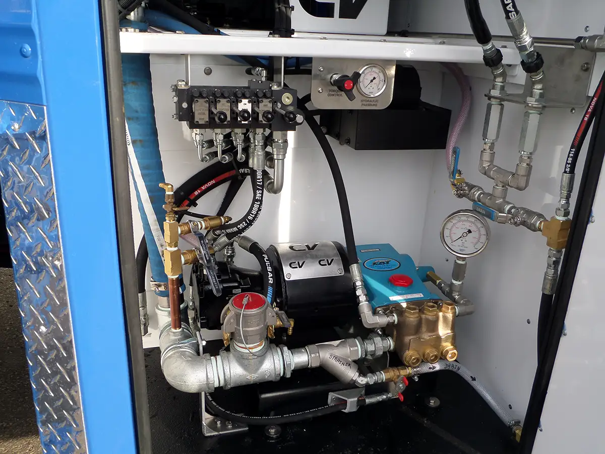 - Three Hydraulic Hose Reels (100′ x 3/8″ pressure hose, 100′ x 3/8″ temperature rated steam hose and a 100′ x 3/8″ degreaser hose).