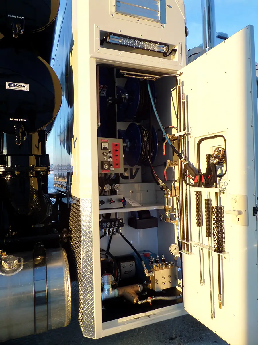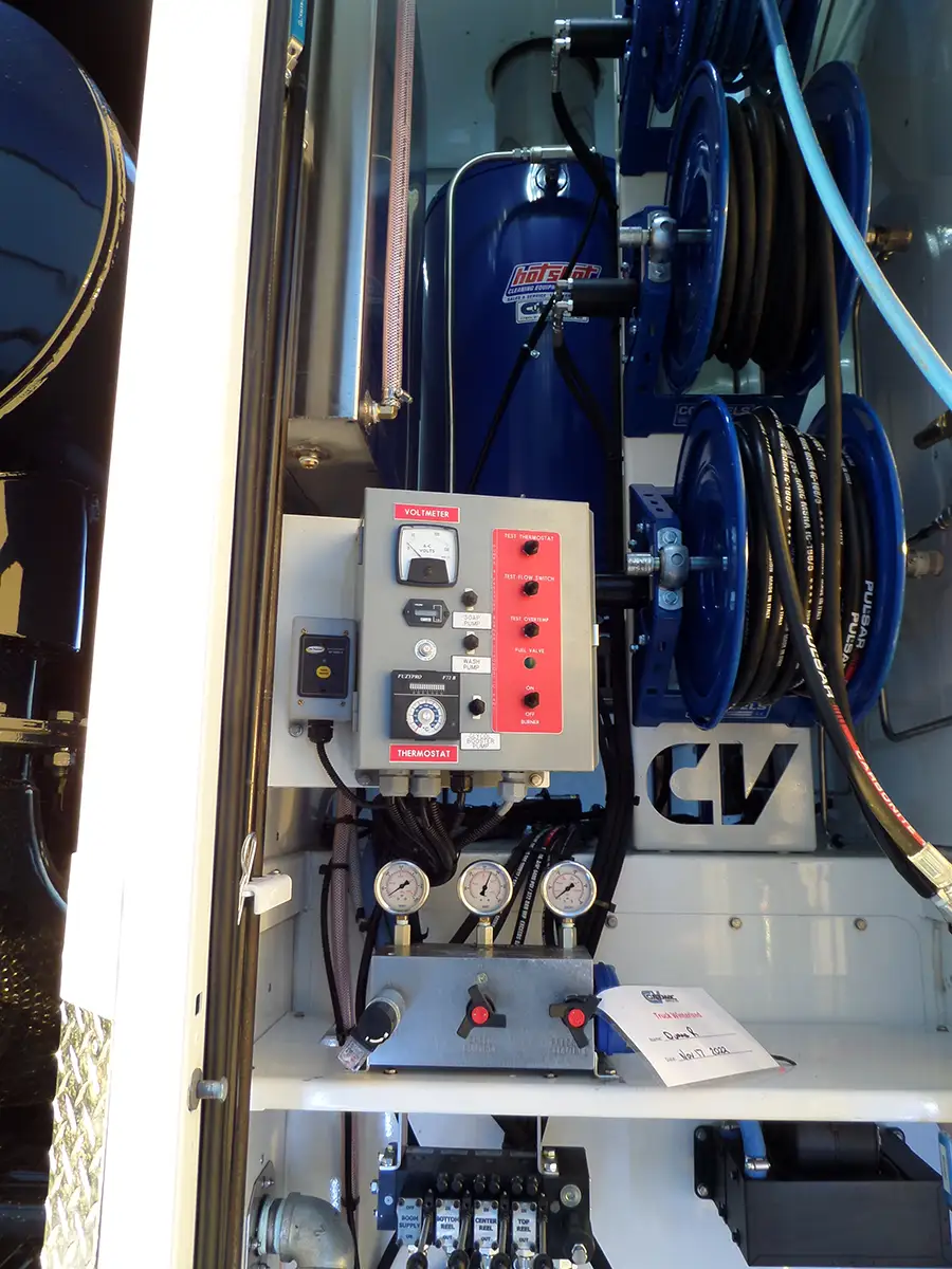 - Two Hydraulic Hose Reels (100′ x 3/8″ pressure hose and 100′ x 3/8″ temperature rated steam hose).
