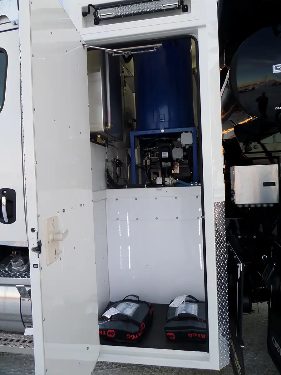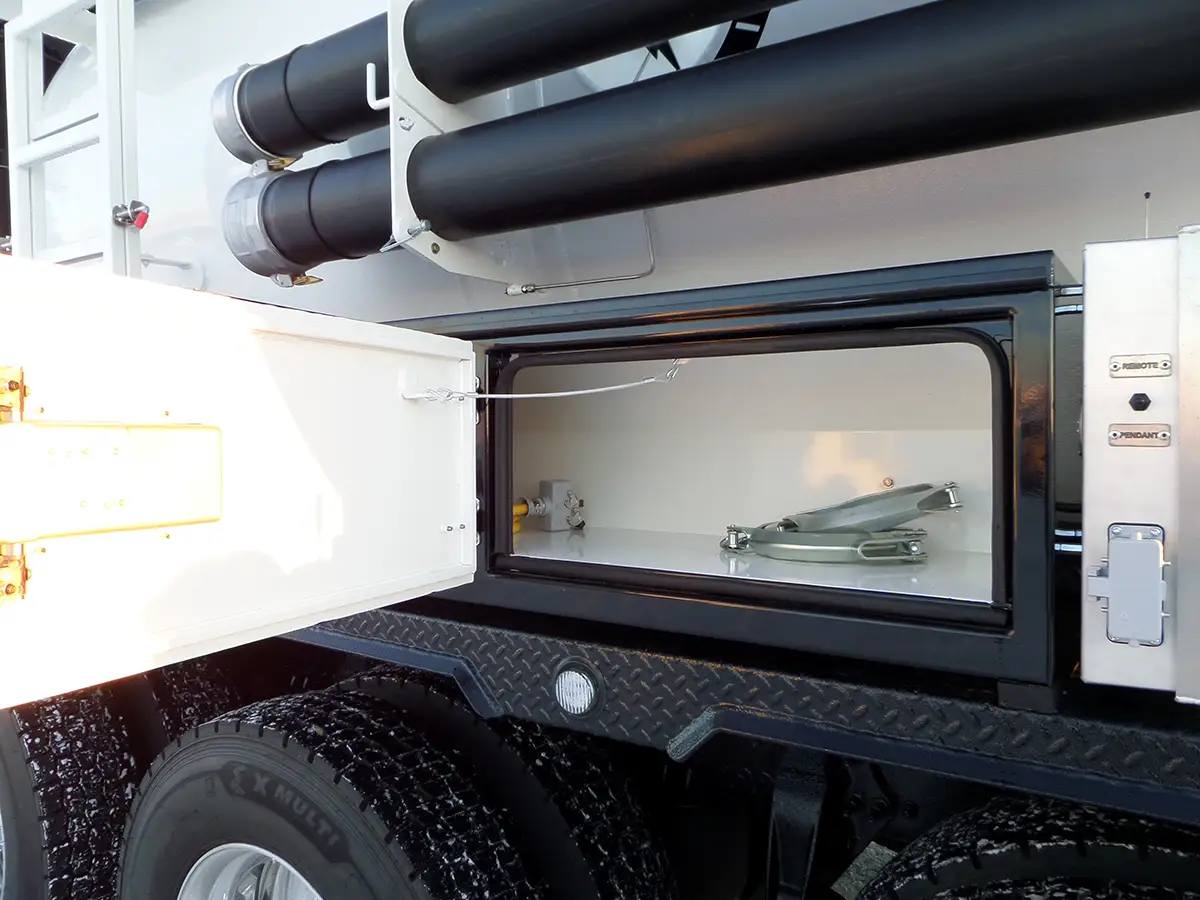 - Full length 1/8” checker plate hose tray/fender assembly with heavy duty outrigger supports & 1-1/4” steel tubing handrails, close in plates